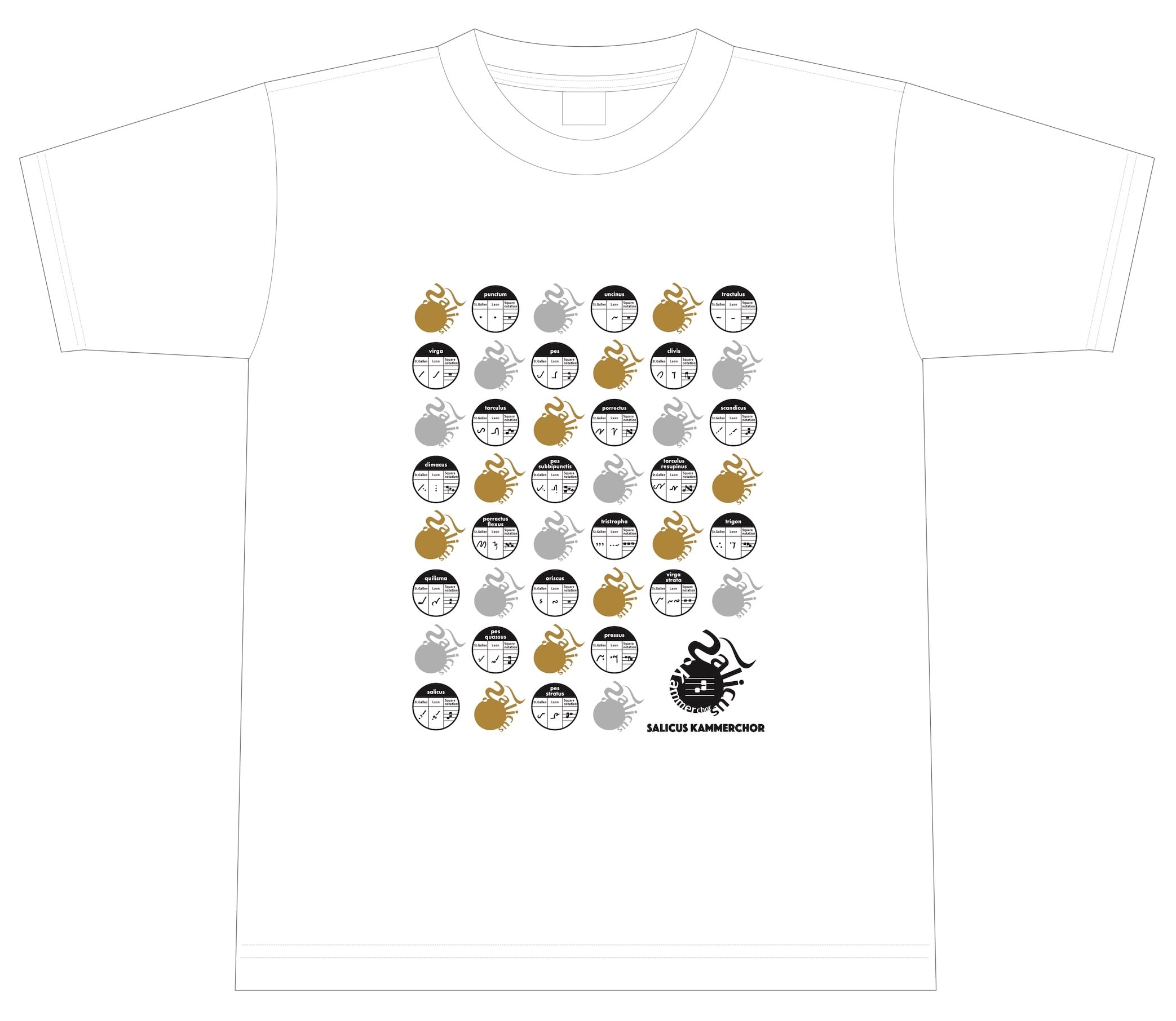 使いやすいホワイト地にサリクスのロゴと古ネウマ(ザンクト・ガレン式とラン式)と四角譜のデザインされたTシャツです。着心地の良いコットン素材です。